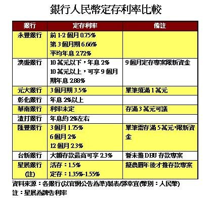 銀行的人民幣定存利率「比價大戰」開打!包括元大、永豐、星展、澳盛、渣打...等銀行均以訂出人民幣定存利率,平均利率約2-3%不等,其中永豐銀為爭搶資金更喊出定存利率最高可飆至6.66%,至於老大哥臺銀則尚未透露存款利率,僅透露明(6)日記者會宣布人民幣業務。